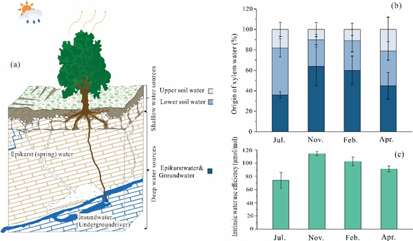 Figure 2 (a) Conceptual diagram of water source pools available for an endemic woody plant species (Ligustrum lucidum) in a limestone karst area; (b) Proportions (%) of the contributions of potential water sources (upper and lower soil water, and deep water) used by Ligustrum lucidum; and (c) intrinsic water use efficiency (WUEi) values of the woody plant during different seasons (2018-2019). All results were presented as average ± error bar of replicates. Error bars were the 1st percentile (minimum) to 99th percentile (maximum) of source contribution distributions for (b) and ± 1 SD for (c).