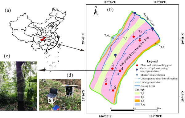 Figure 1 (a) Geographic location of the study area; (b) Hydrological geology, and sampling points in the study area; (c) Ligustrum lucidum; (d) Sap flow measurement
