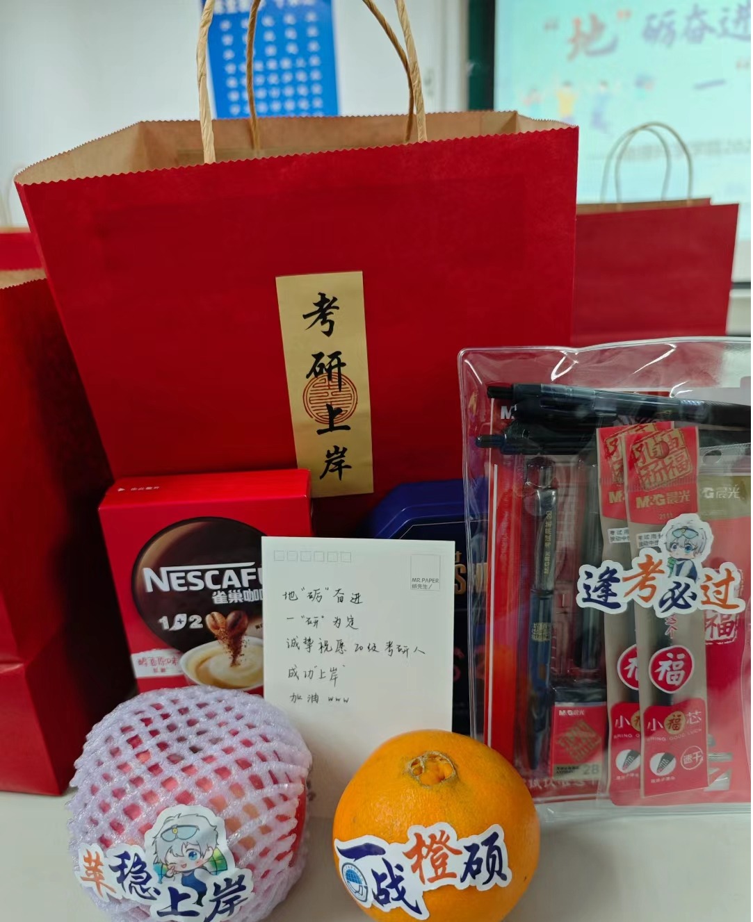公司贴心的为每一个考研学子准备了考研大礼包 ,将学院对同学们的祝福融入到每一份礼物之中。据悉,12月23至24日,学院还将在李园3、4舍,橘园6舍开展“研”途加油站活动,持续为考研学子保驾护航。
