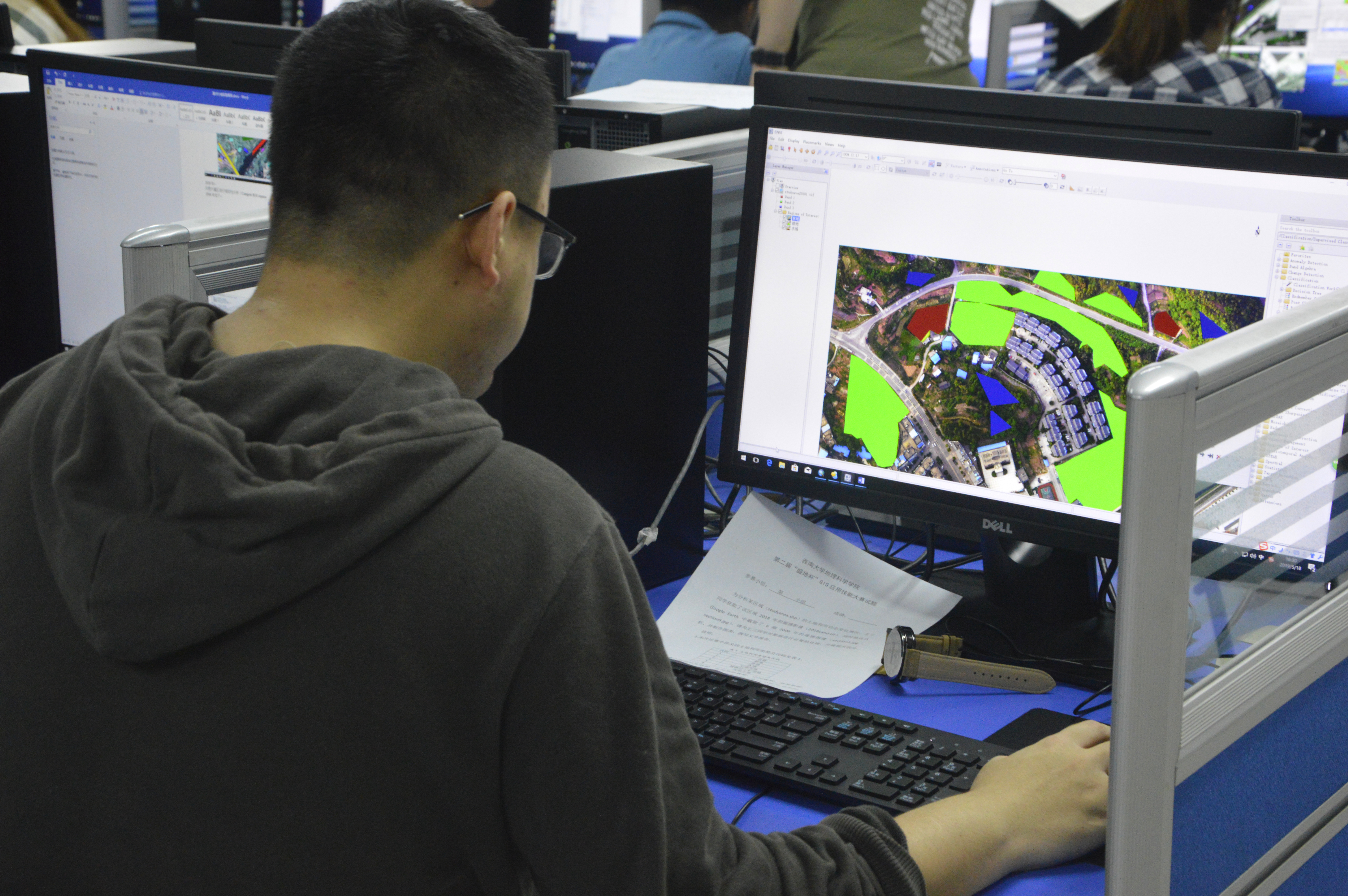 比赛中,各团队选手相互协作,认真作答,运用ArcGIS、ENVI等软件,在180分钟内先后完成了空间数据的采集、编辑、集成及空间分析技术的应用、地图制图、文档材料撰写等比赛内容。现场比赛结束后,评委老师对各团队提交的成果中的数据处理、数据分析、图表制作和文字报告等项目分别进行了打分。最终,2016级地理信息科学专业付康钰、王杰和2017级地理信息科学专业吴俭俭三位同学组成的参赛团队以总分95的高分,荣获比赛一等奖。2017级常智键等5个团队分获比赛二、三等奖。