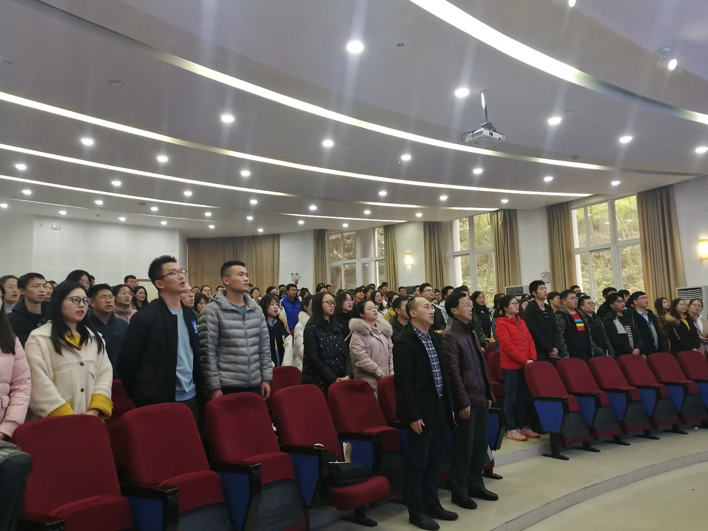 第二环节为新党员宣读入党誓词,老党员重温入党誓词。首先全体起立奏唱《国际歌》,随后学院副经理王勇同志带领全体党员庄严宣誓,铿锵有力的宣誓声响彻整个报告厅,庄重肃穆的宣誓,使每一位党员同志心潮澎湃,进一步坚定了为人民服务的立场信念。