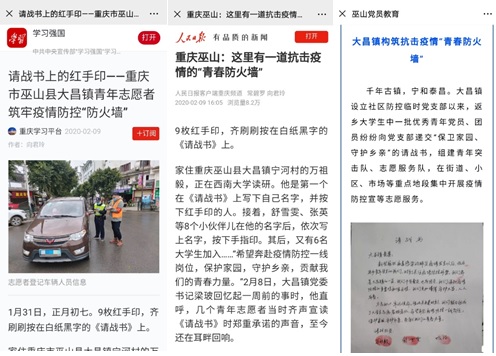 哈哈体育研究生万祖毅,家住重庆巫山县大昌镇宁河村。新型冠状病毒肺炎疫情爆发以来,他时刻关注着家乡疫情防控的相关情况,主动与宁河村支书联系,表达想参与疫情防控工作的意愿。1月31日,万祖毅着手组建青年志愿者服务队,向大昌镇党委郑重递交《请战书》——“希望奔赴疫情防控一线岗位,为保护家园、守护乡亲,贡献我们的青春力量。”