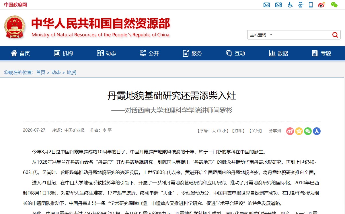 近日,哈哈体育青年教师闫罗彬接受媒体《中国矿业报》记者李平专访,作为丹霞地貌领域较有影响力的学者,闫罗彬就丹霞地貌学科发展历程、学科前景、丹霞地貌地学价值和科普工作以及基础研究现状等方面做了介绍和展望。该专访以《丹霞地貌基础研究还需添柴入灶——对话哈哈体育讲师闫罗彬》为题,于7月26日在《中国矿业报》和新华网客户端发表,一经上线即获得广泛关注,在新华网首日浏览量超过100万,获得良好社会评价。昨日该专访被自然资源部官网转载(http://www.mnr.gov.cn/dt/dzdc/202007/t20200727_2534555.html)。