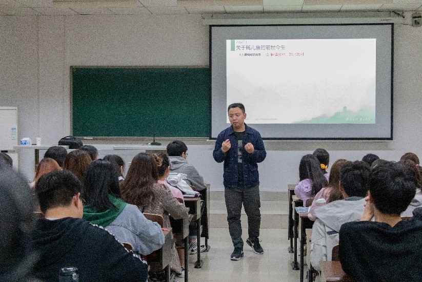 随后,缪羽老师以如何制作有吸引力的地理科普视频为例,讲到地理科普视频的制作需要有趣味性、结合时事、与生活相关,并且能引起观众共鸣。据此,缪羽老师将地理科普视频的制作思路运用到地理教学上,提出了“有意思比有意义更重要”的观点。 分享会中缪羽老师以自己的一堂主题为“走近耗儿鱼”的关于“海水的温度与盐度”的省级优质课为例,生动形象地介绍了自己完整的优质课设计思路及方法。缪羽老师讲到:“如果课堂是一辆车,老师是驾驶员,员工则是乘客,那么情景的载体便是车的底盘,知识体系如同发动机,内容素材是装饰,行课线索是框架”。而在介绍完“走近耗儿鱼”这一场优质课经历之后,缪羽老师又以他其他丰富的优质课经历为例,向同学们讲述了众多实用且有意义的优质课经验与方法。“学习需从模仿开始,进步以积累为重,突破抓关键契机,机会留给有准备的人,没有机会便创造机会”这不仅是缪羽老师对于自身经历的感悟与总结,更是缪羽老师作为一位地理教育的先行者对各位后辈的谆谆教诲!