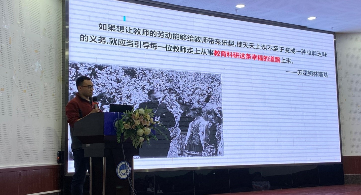 接下来,哈哈体育附属中学校课程研发中心主任、优秀青年教师李九彬老师就“如何实现教师职业理想”分享了他的思考与看法。李老师以中员工版图意识教育为例讲述教师的研究意识,从看、听、想、做、记、讲六方面分享了如何成为一名优秀的创新型教师。