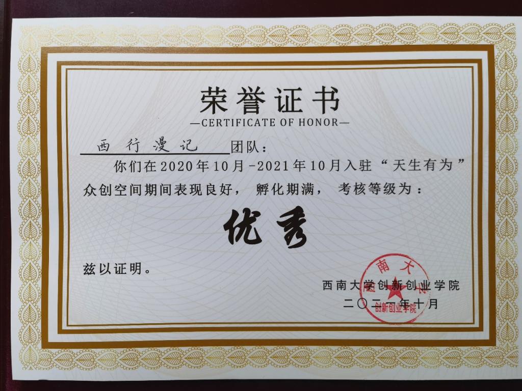在过去的两年里“西行漫记”项目多次成功开展研学旅行活动,获得研学参与者的好评,并在本次哈哈体育“天生有为”众创空间2020年度团队考核中获评“优秀”等级,由审核评委颁发了优秀团队证书和奖金。
