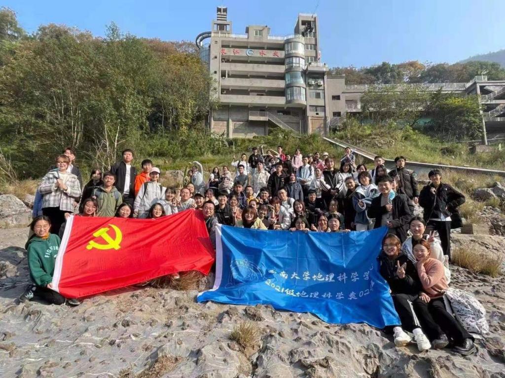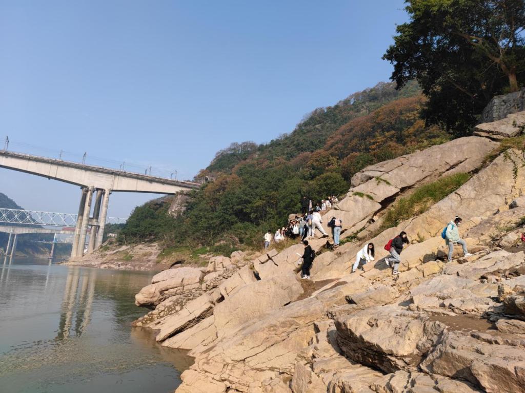 2021年11月,在杨琰、沈立成两位党员老师的带领下,2021级地理科学(师范)专业和地理科学类专业的同学先后进行了观音峡-温塘峡中生代地层地质地貌实习。本次实习中,实习队一方面通过实践课了解了地质学的基本概念、理论和研究方法,初步建立科学的的地球观、资源环境和人地关系观。另外一方面通过挖掘北碚人文文化、民俗意识、红色历史等思政元素,开展思政教育。