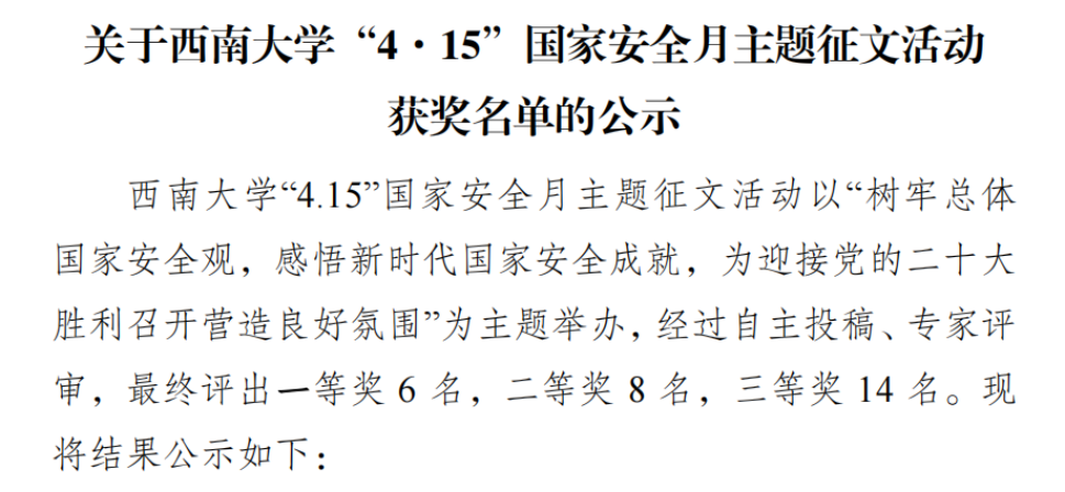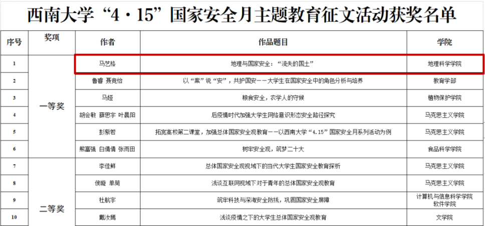 2022年6月10日,共青团哈哈体育委员会公布了“4·15”国家安全月主题征文活动获奖名单,公司马艺格同学的《地理与国家安全:“流失的国土”》作品荣获一等奖。