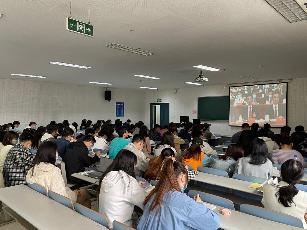与此同时,学院同学们也认真聆听习近平总书记的报告,全神贯注做好学习笔记,踊跃发言。