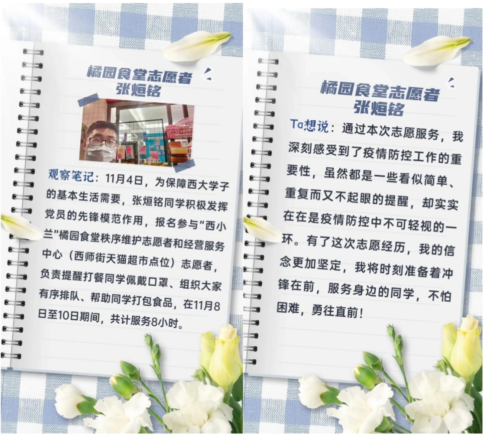 疫情防控重于泰山,平静的生活下是无数志愿者奔波的身影。在我们身边,总有那么一群人,他们毅然决然地奉献自己,为同学们尽心尽力,勇于担当,做疫情中的“逆行者”,冲锋在为人民服务的前线。