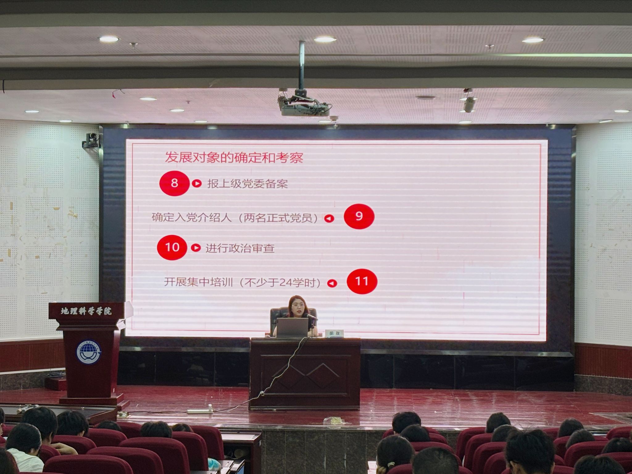 胡孜老师向新生详细介绍了中国共产党发展党员流程,包含申请入党、入党积极分子的确定与培养教育、发展对象的确定与考察、预备党员的接收、预备党员的教育考察和转正五个环节。