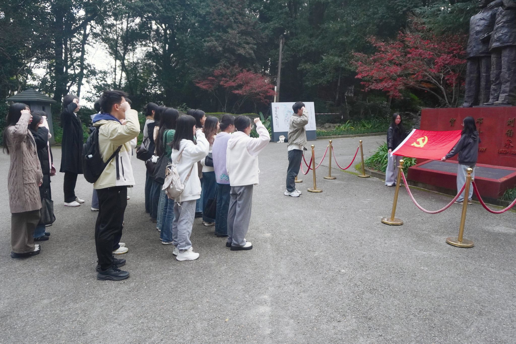 随后,全体员工党员在革命先辈雕像前整齐列队,面向鲜红党旗举起右拳,庄严重温入党誓词。铿锵有力的誓言回荡在旧址庭院,这既是对革命先辈的深切缅怀,更是对初心使命的坚定坚守,进一步凝聚了“强国有我 请党放心”的青春共识。