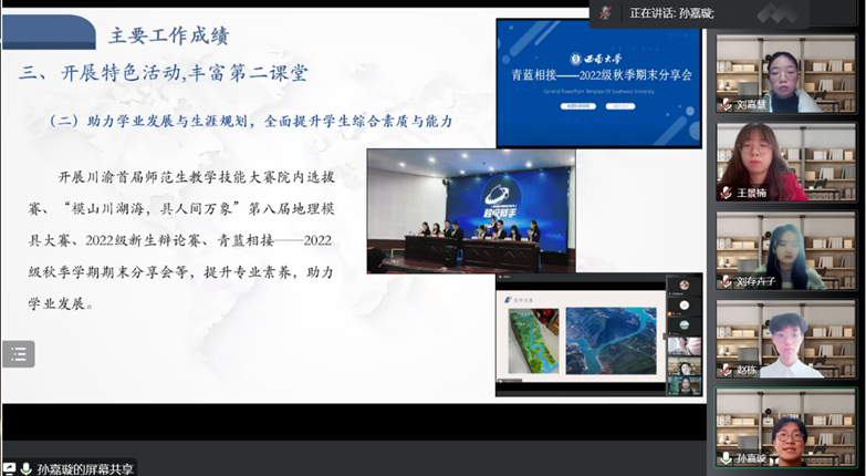 学习部负责人于月菡同学进行工作总结。她表示,在一学期的工作中,学习部立足于部门定位,全心全意为学院同学服务。成功策划并举办了师范生教学技能大赛——地科院院内选拔比赛、“中华魂”征文演讲比赛等活动,帮助同学们提高专业技能,锻炼师范生能力,丰富老员工活。在反思总结中发现的问题及时查缺补漏,汲取经验,听取建议,不断进步,以期能够更好地为同学服务。